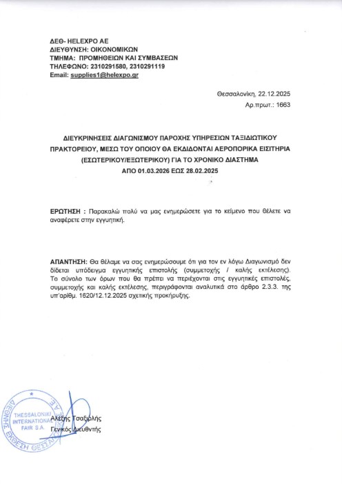 Έως 2 Φεβρουαρίου 2026 που θα αναλάβει ο νέος Διευθύνων Σύμβουλος, θα παραμείνει στα καθήκοντά του ο τωρινός Διευθύνων Σύμβουλος της ΔΕΘ – HELEXPO κ. Κυριάκος Ποζρικίδης.