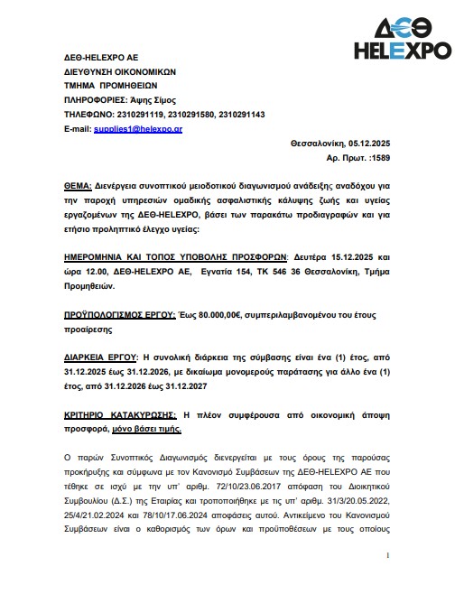 Διαγωνισμός για την ομαδική κάλυψη ζωής και υγείας του προσωπικού της ΔΕΘ-HELEXPO AE